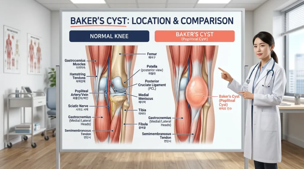 ✅ 무릎 뒤쪽에 혹이 만져지면 베이커낭종(슬와낭종) 가능성 — 연관 관절 질환 동반 확인 필수